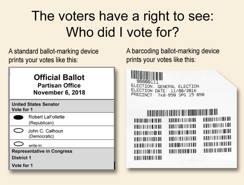 not the text the voter is able to verify. If an audit or recount using the votes recorded in the text produces different results than the results the tabulators produced using the votes recorded in the QR codes, and voter verification was not witnessed and documented by poll workers, no one has any way to tell whether the text or the QR code is correct.